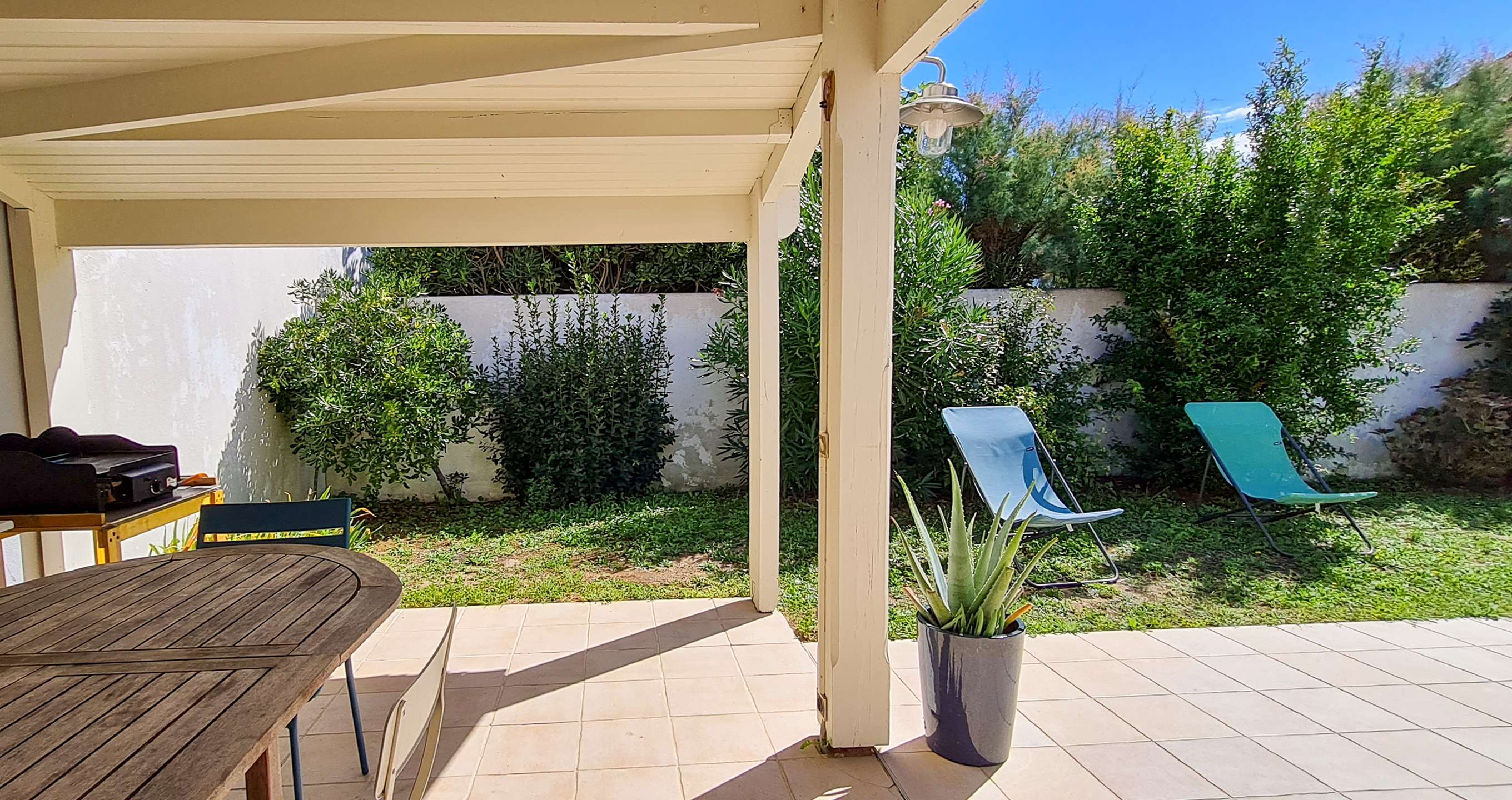 Jardin clos avec partie salon de jardin avec transats, barbecue, table et chaises de jardin