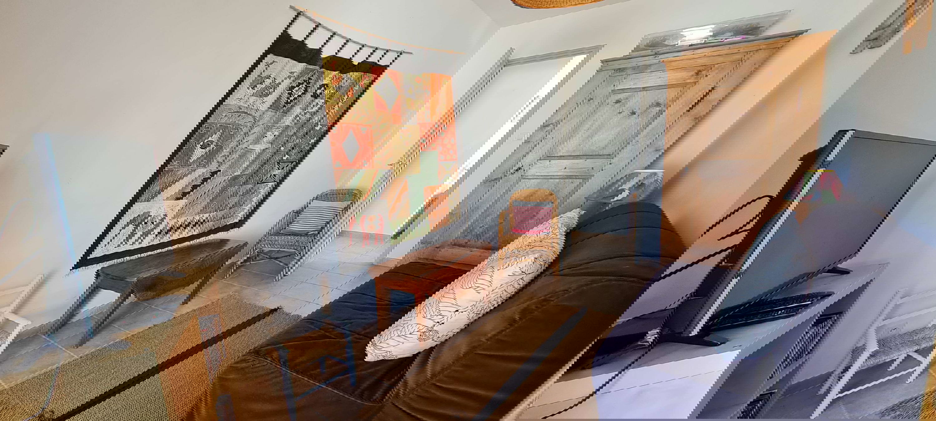 comprenant PIECE A VIVRE (ouest) 50 m² : coin cuisine Réfrigérateur/congélateur 100+60L, four vapeur, four électrique, plaque vitrocéramique, lave vaisselle - coin salon : canapé, table basse, télévision - coin salle à manger : table, chaises