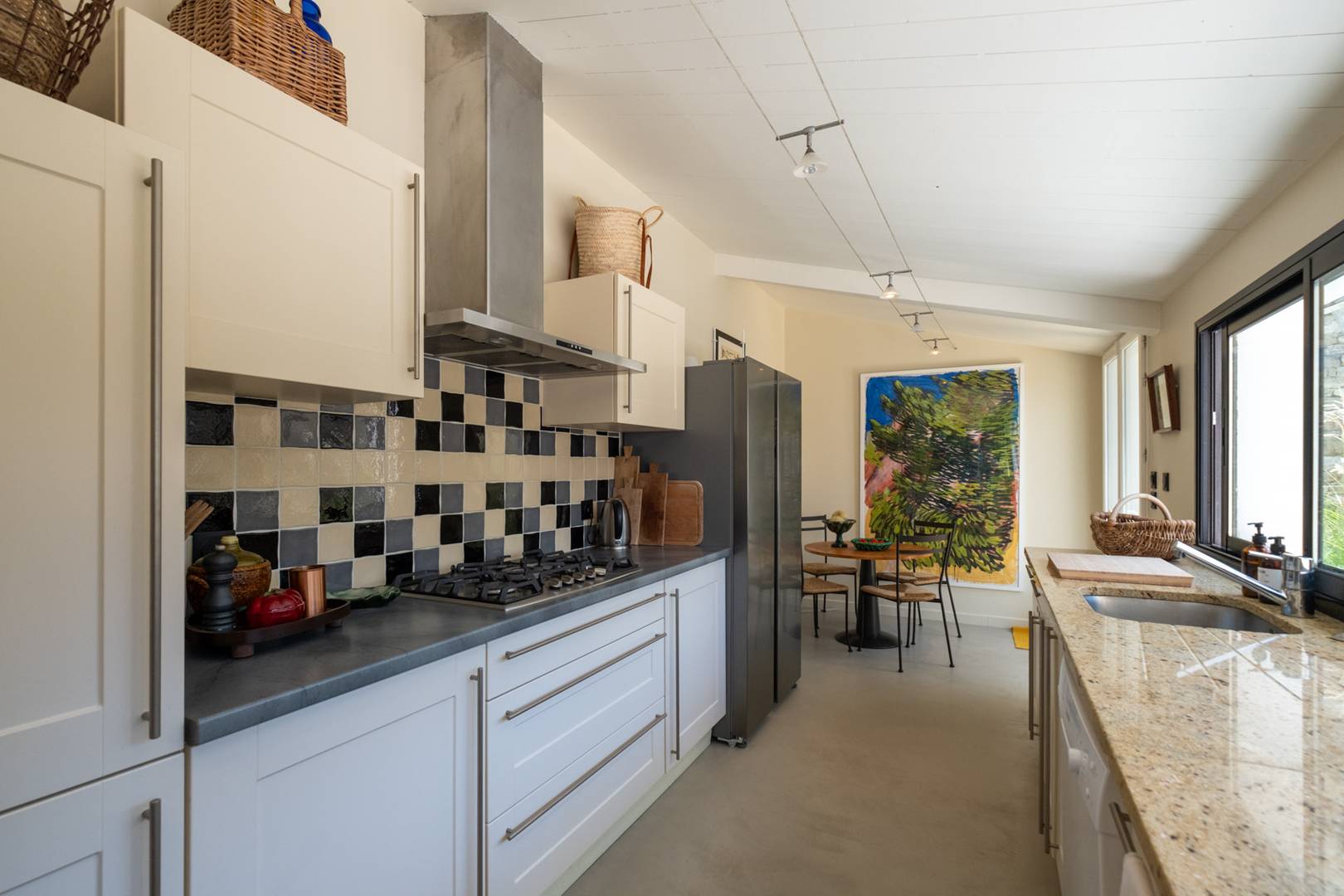 Eine voll ausgestattete amerikanische Küche mit Zugang zur Terrasse - ein Essbereich für 3 Personen in der Küche