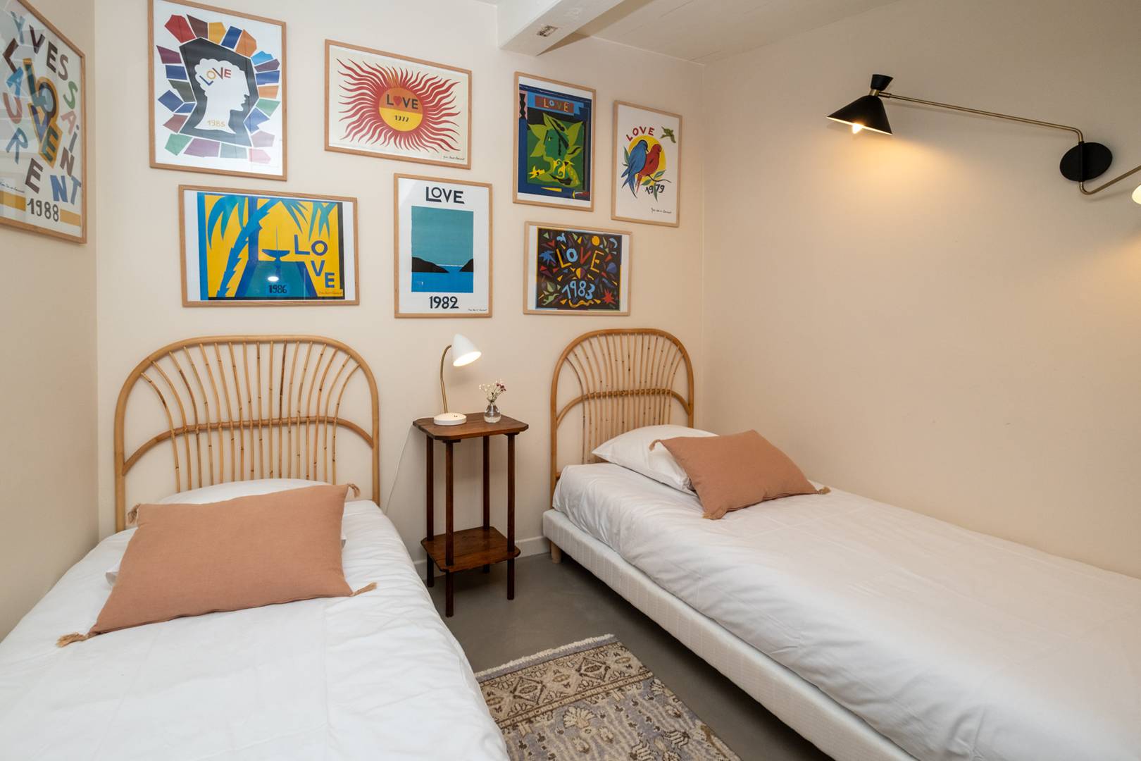 Schlafzimmer 3 und 4 (Familiensuite): ein Schlafzimmer mit einem 140 cm breiten Reihenbett, das zu einem Schlafzimmer mit zwei 90 cm breiten Einzelbetten oder einem 180 cm breiten Bett führt. Die beiden Schlafzimmer teilen sich ein Badezimmer und eine Toilette.
