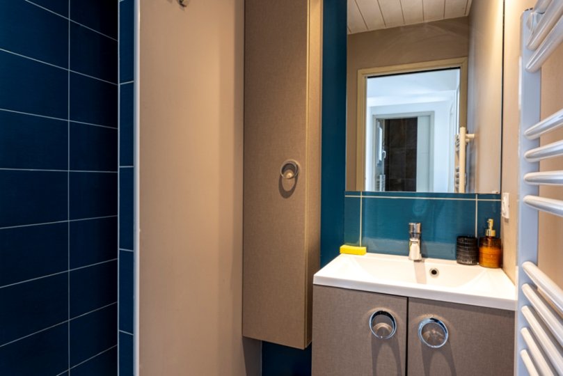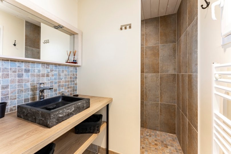 Der Schlafbereich besteht aus 4 Schlafzimmern: 2 Doppelzimmern, einem Schlafzimmer mit 2 Einzelbetten und einem „Kinder“-Schlafzimmer mit Etagenbett und einem Einzelbett sowie einem Badezimmer und 2 Duschräumen.