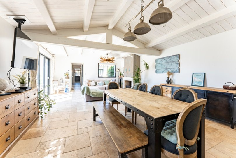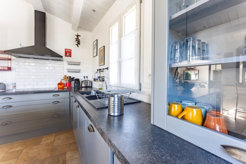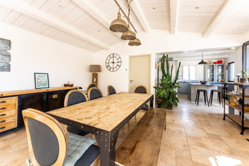 Der Wohnbereich besteht aus einer Einbauküche mit Kochinsel, die zum Esszimmer und Sitzbereich hin offen ist.