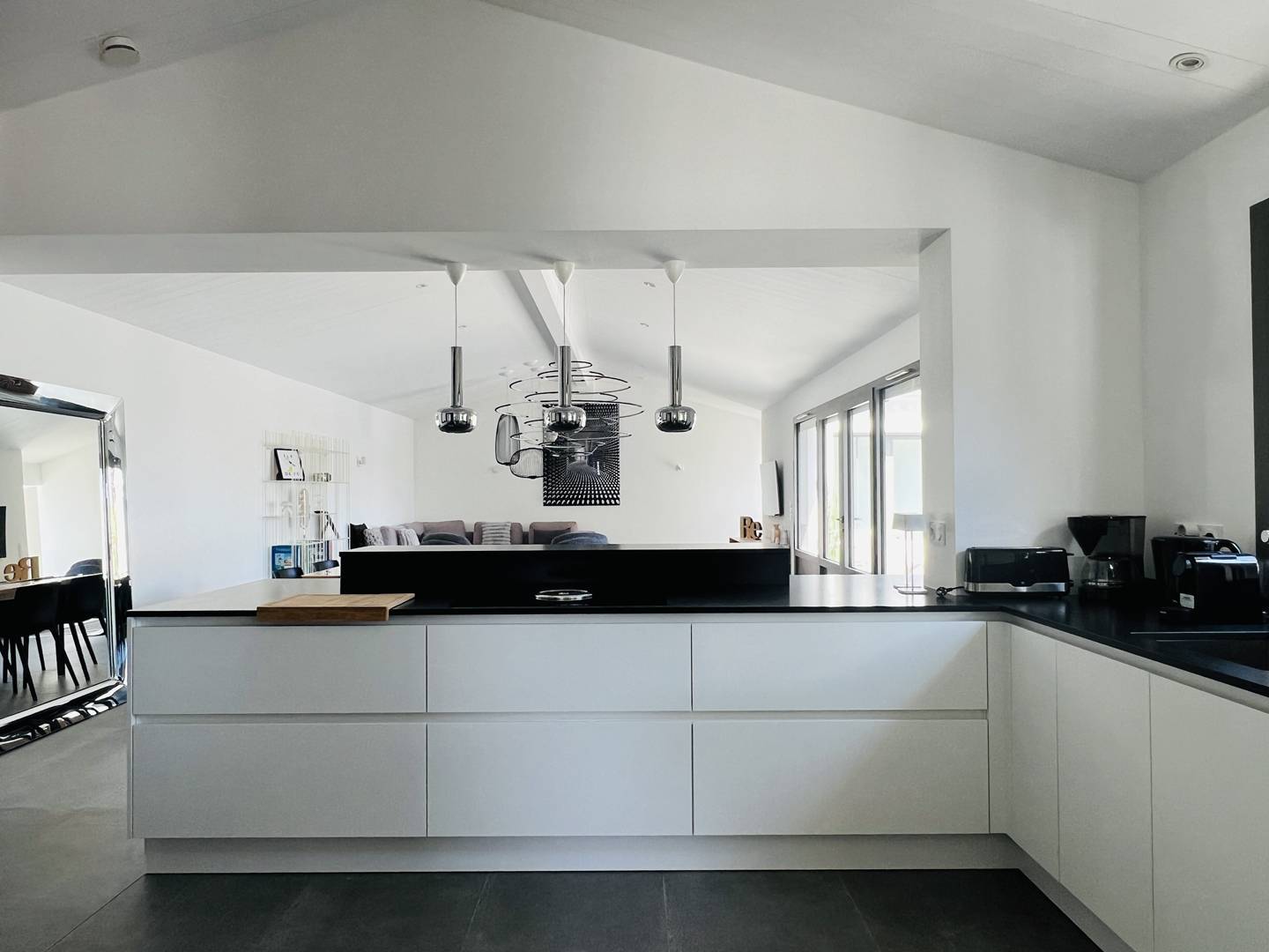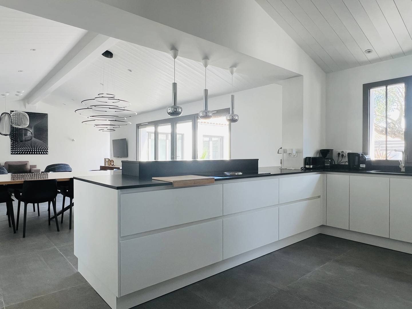 Einstöckige Villa, ihr großes, helles Wohnzimmer öffnet sich zum angelegten Garten und dem privaten Swimmingpool (8 x 4 m), ihre offene und gut ausgestattete Küche.