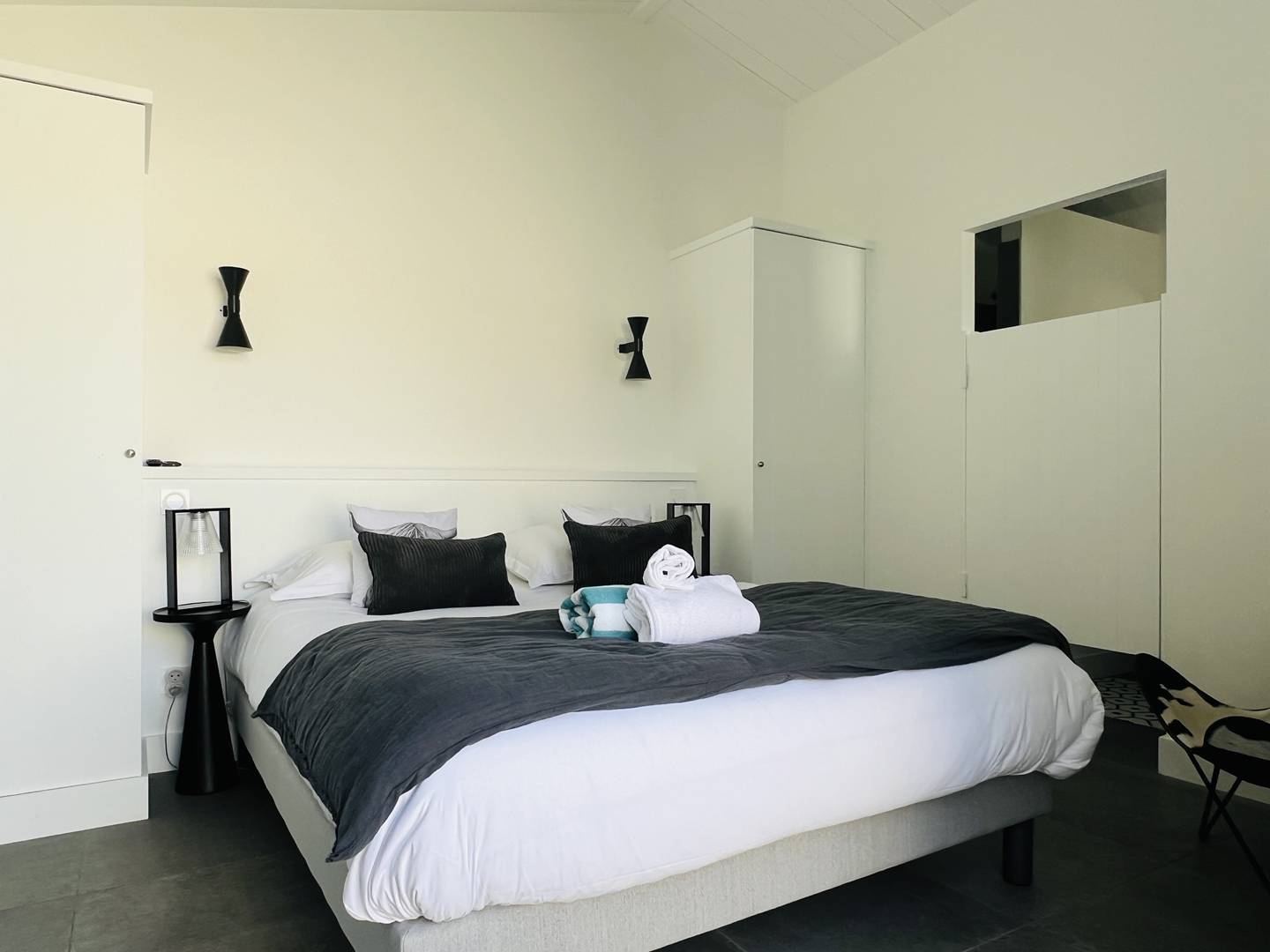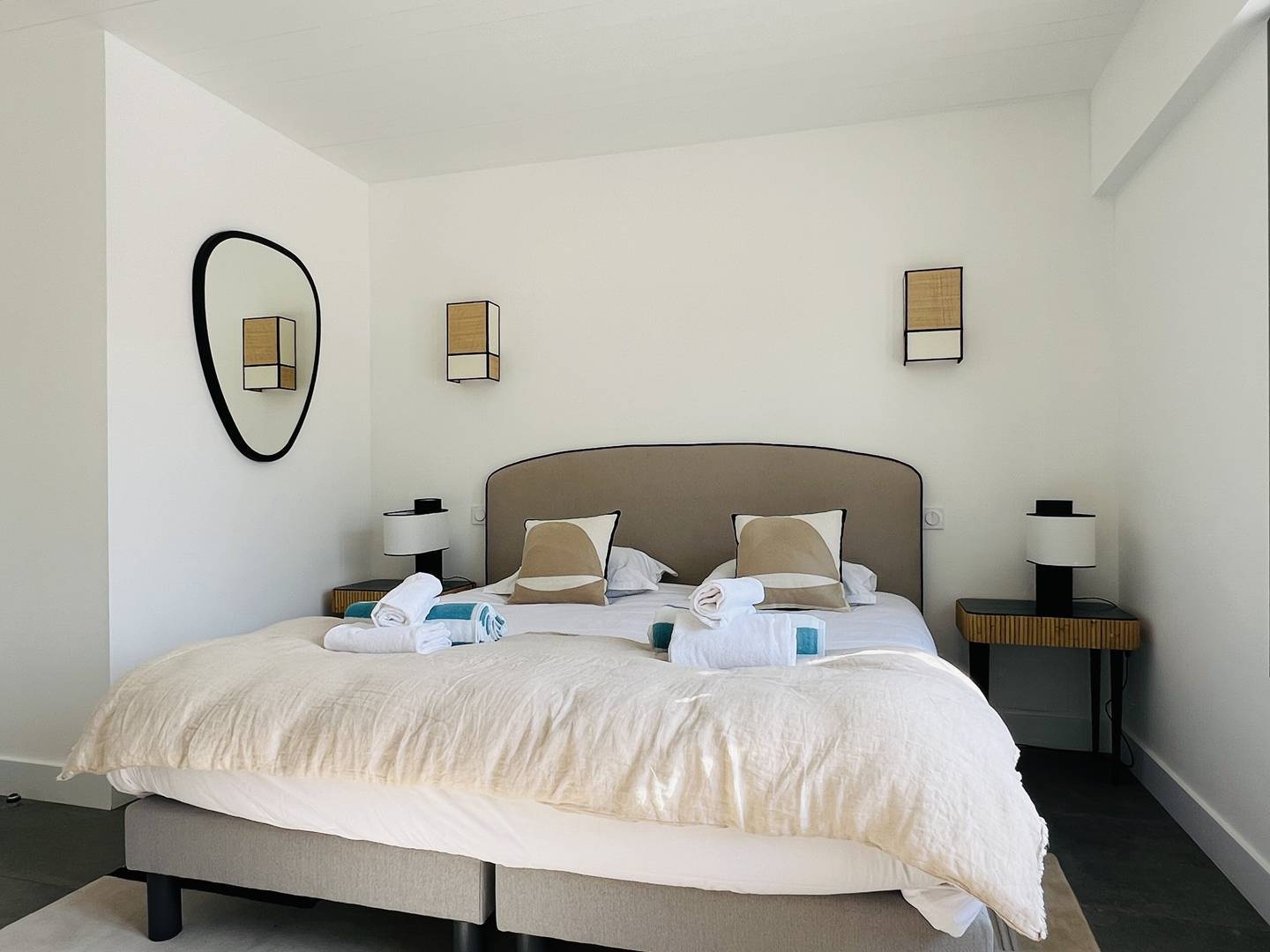 Der Hauptteil verfügt über 4 geräumige Schlafzimmer (eines mit einem 180x200 cm großen Bett, zwei mit einem 160x200 cm großen Doppelbett und eines mit einem 140x200 cm und 90x200 cm großen Etagenbett). Jedes verfügt über ein eigenes Badezimmer mit ebenerdiger Dusche, eines der Schlafzimmer ist mit einer Badewanne ausgestattet.