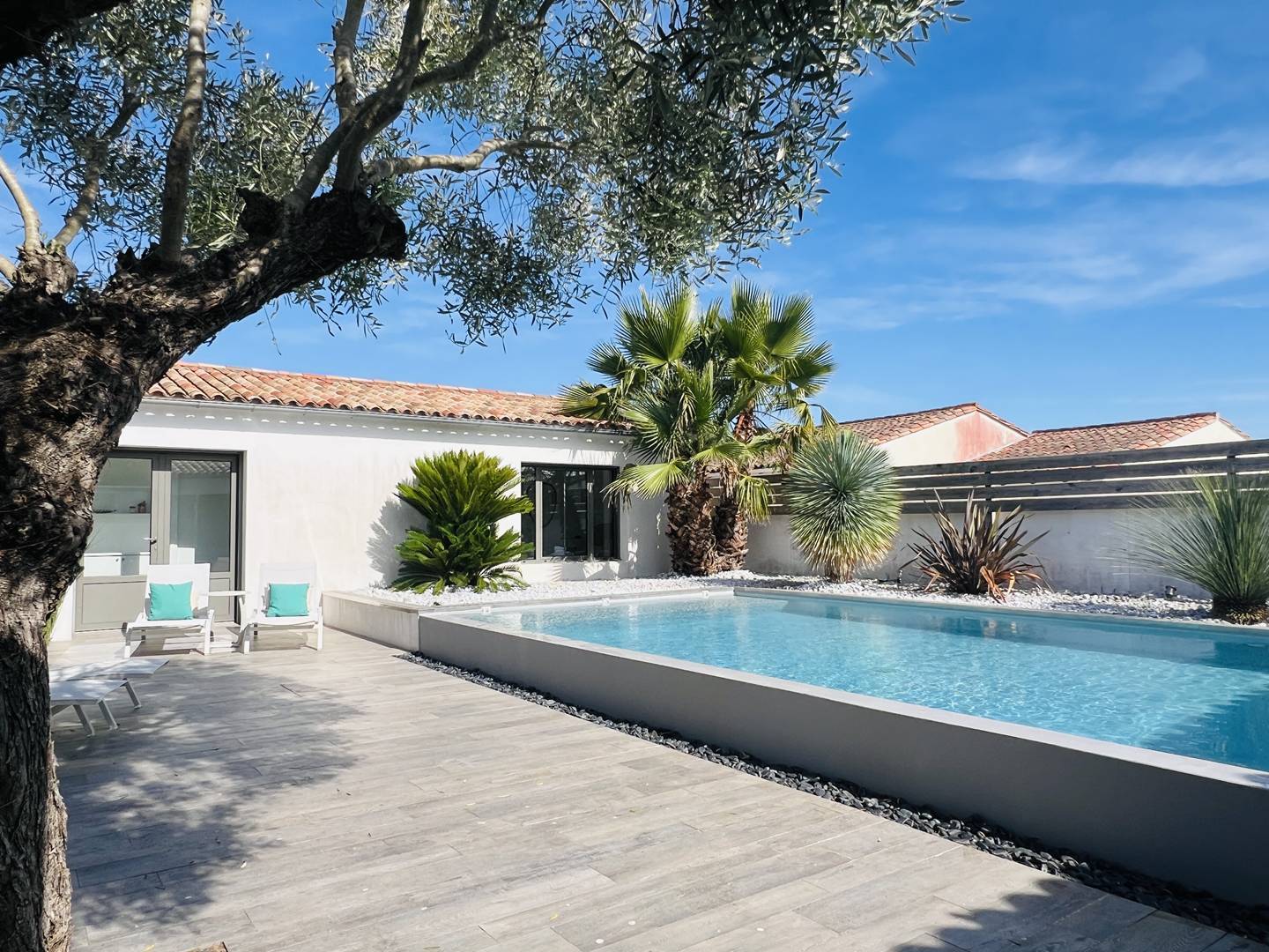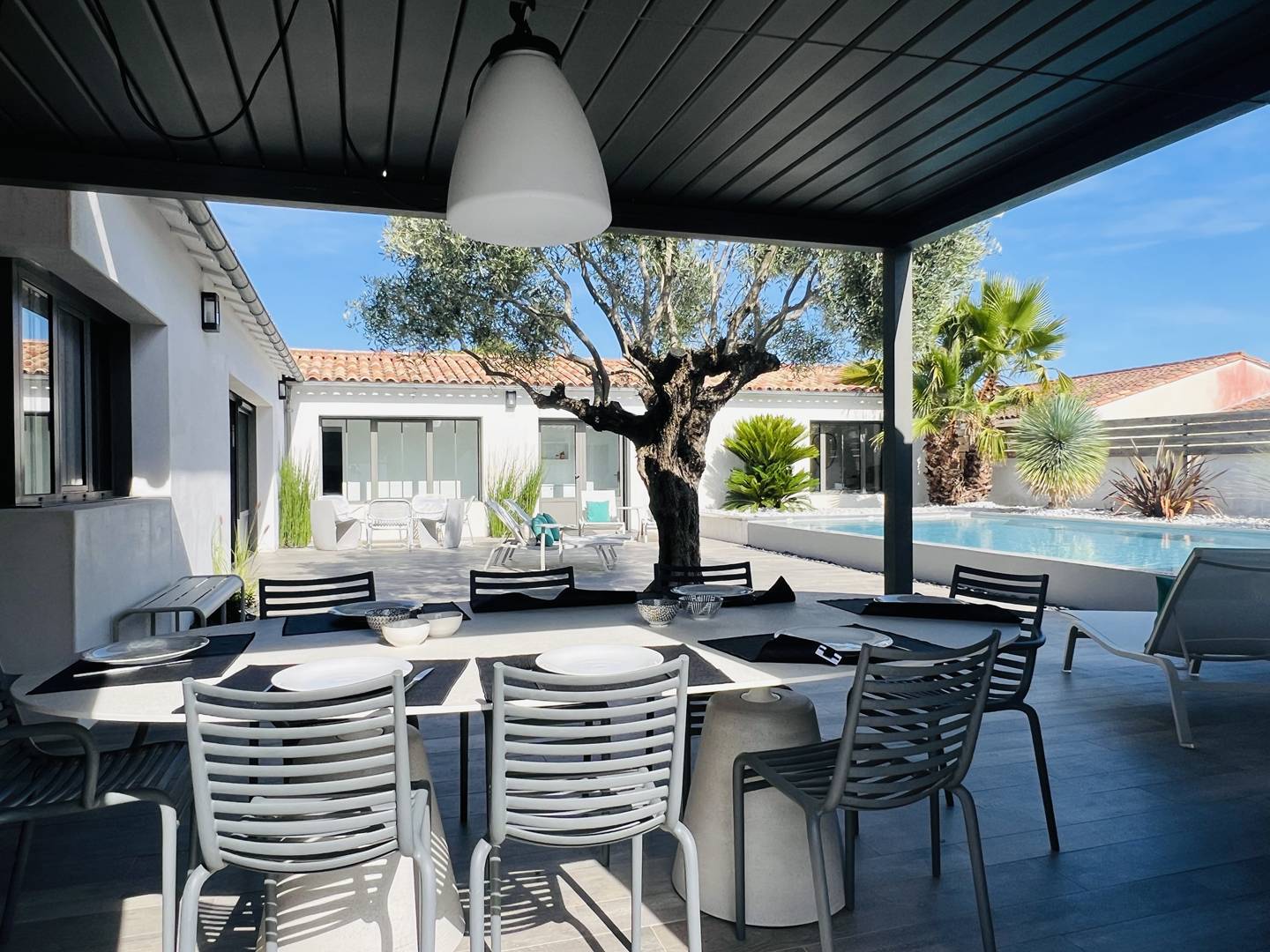 Im Außenbereich erwartet Sie ein herrlicher Infinity-Pool, umgeben von einer bepflanzten Terrasse. Die verstellbare Pergola bietet Ihnen zu jeder Jahreszeit einen Entspannungsbereich.