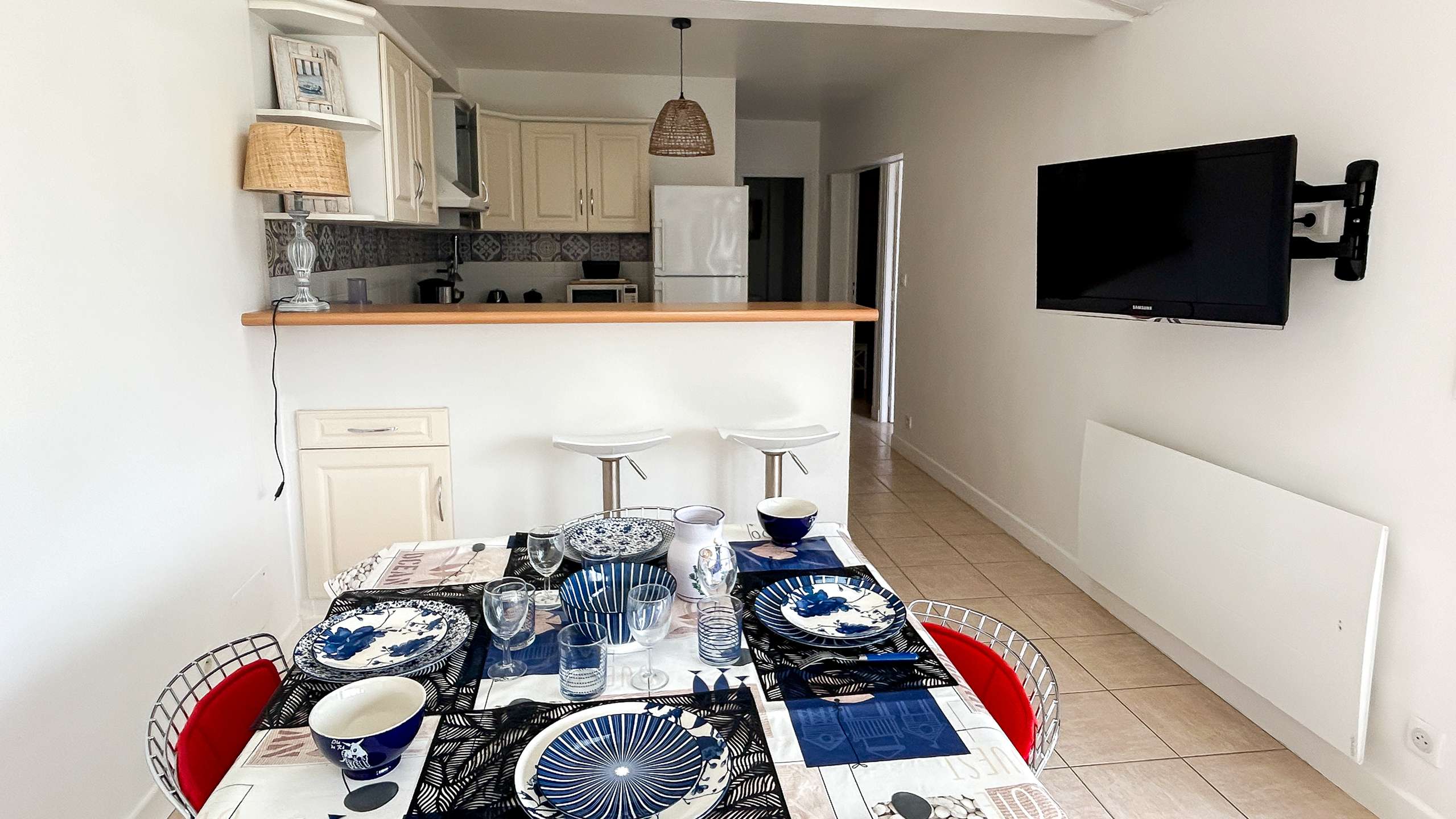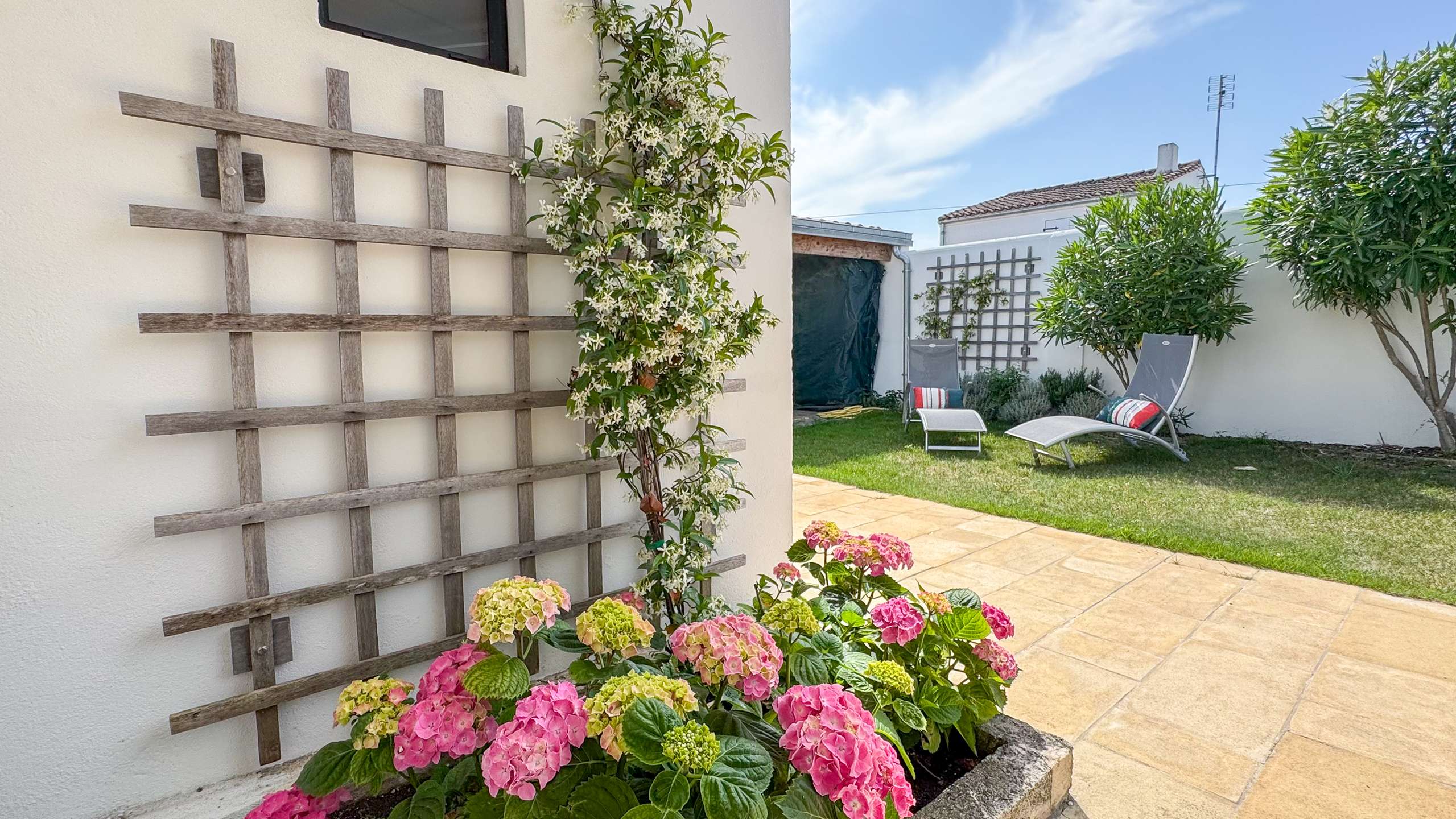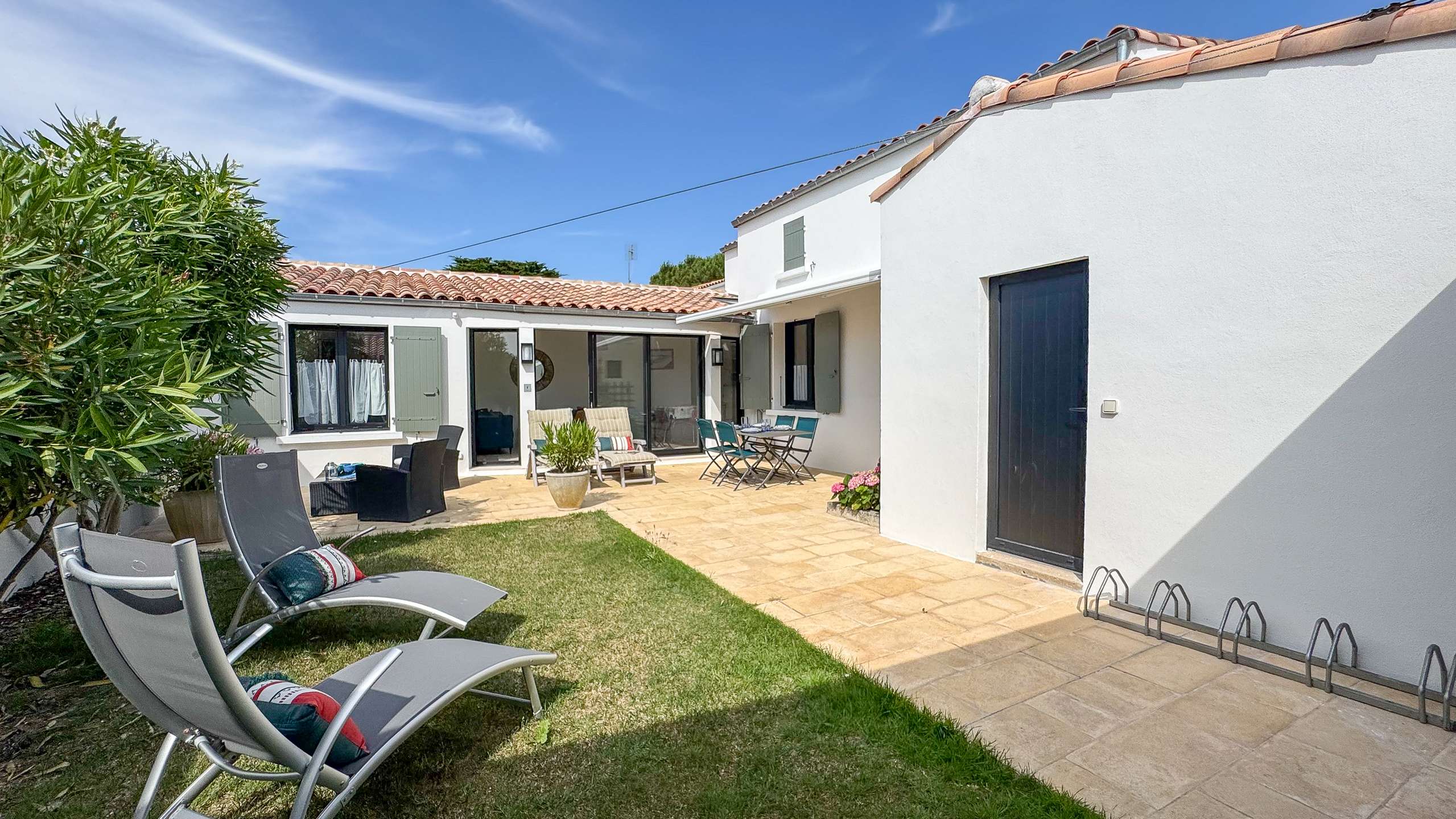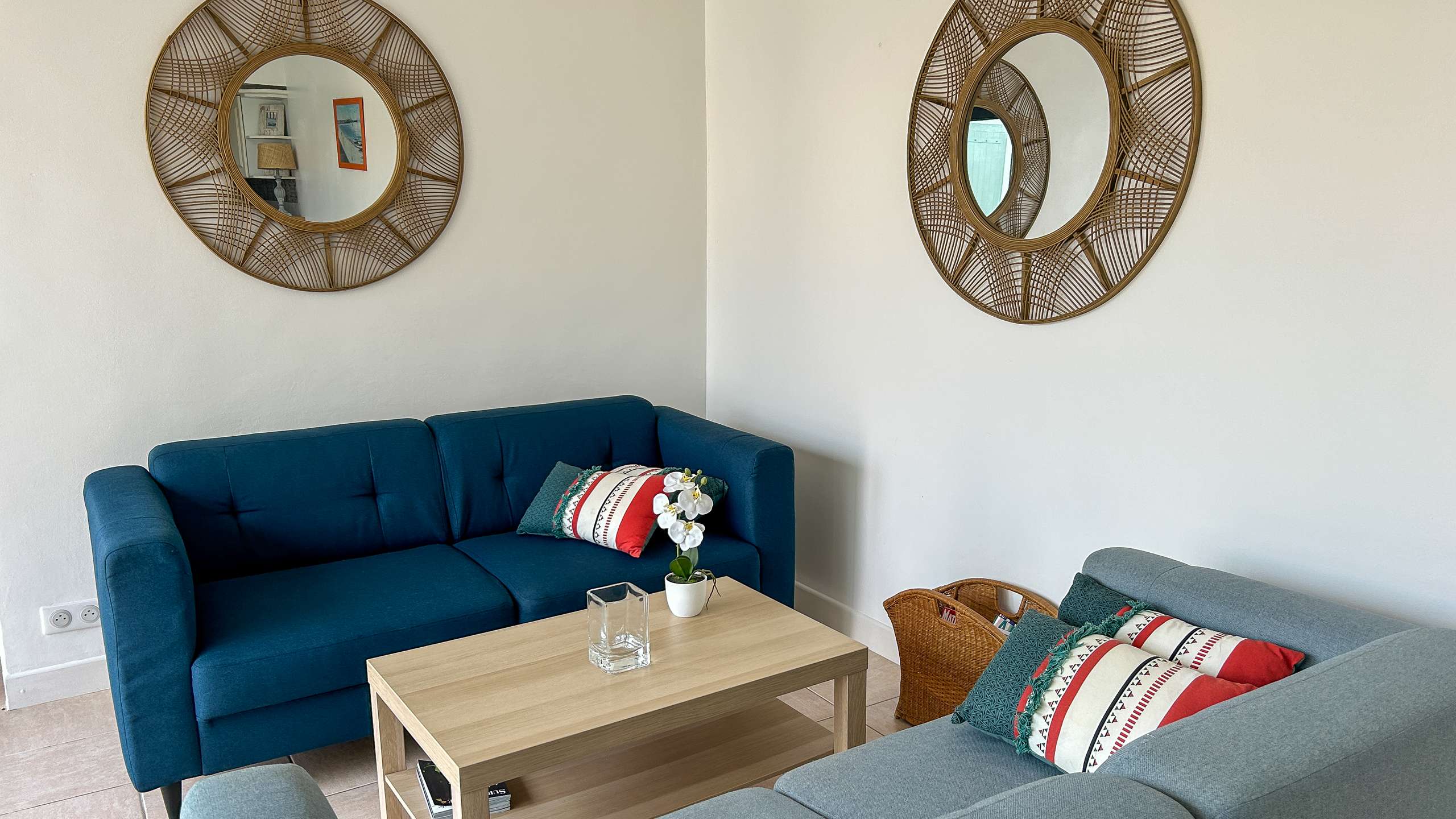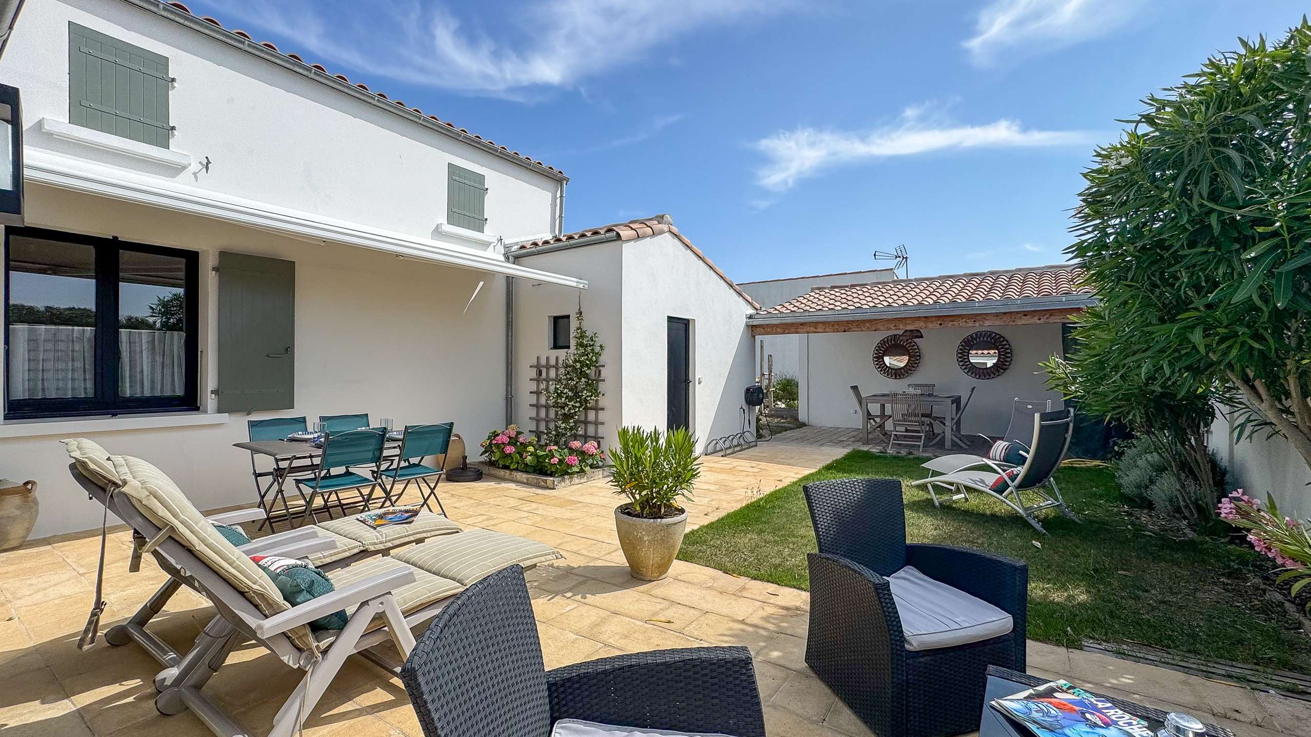 Charmante Mietwohnung in Strandnähe Charmante Mietwohnung in Strandnähe, komplett im Retais-Stil renoviert, bestehend aus einem HAUPTRAUM (West) 30m² mit einer ausgestatteten Küche: Spüle, Herd (3 Gasflammen, 1 Elektrofeuer), Backofen, Geschirrspüler, eine Mikrowelle, ein 232L Kühlschrank + 75L Gefrierschrank, eine Nespresso-Kaffeemaschine, Stauraum. Wohnzimmer mit Esstisch, Stühlen und Wohnzimmer mit Sofa, 2 Sesseln, Couchtisch, Fernseher. SCHLAFZIMMER 1 (Nord) 13m² mit 1 Bett x 160, Nachttischen, Hängeschrank (Kleiderschrank + Regale). SCHLAFZIMMER 2 (West) 10m² mit 2 Betten x 90, Hängeschrank (Kleiderschrank + Regal). BADEZIMMER (blind) 5m² mit Dusche, Waschbecken, Handtuchtrockner, Stauraum. Separates WC. KELLER mit Waschmaschine und Abstellraum. AUSSEN: eine Westterrasse von 13m² (mit Gartenmöbeln) und ein Gartenteil von 21m². 2. Terrasse von 20m² mit Gartentisch und Stühlen, Grill. WIFI Parkplatz. HAUSHALTSWÄSCHE UND ENDE REINIGUNG INKLUSIVE
