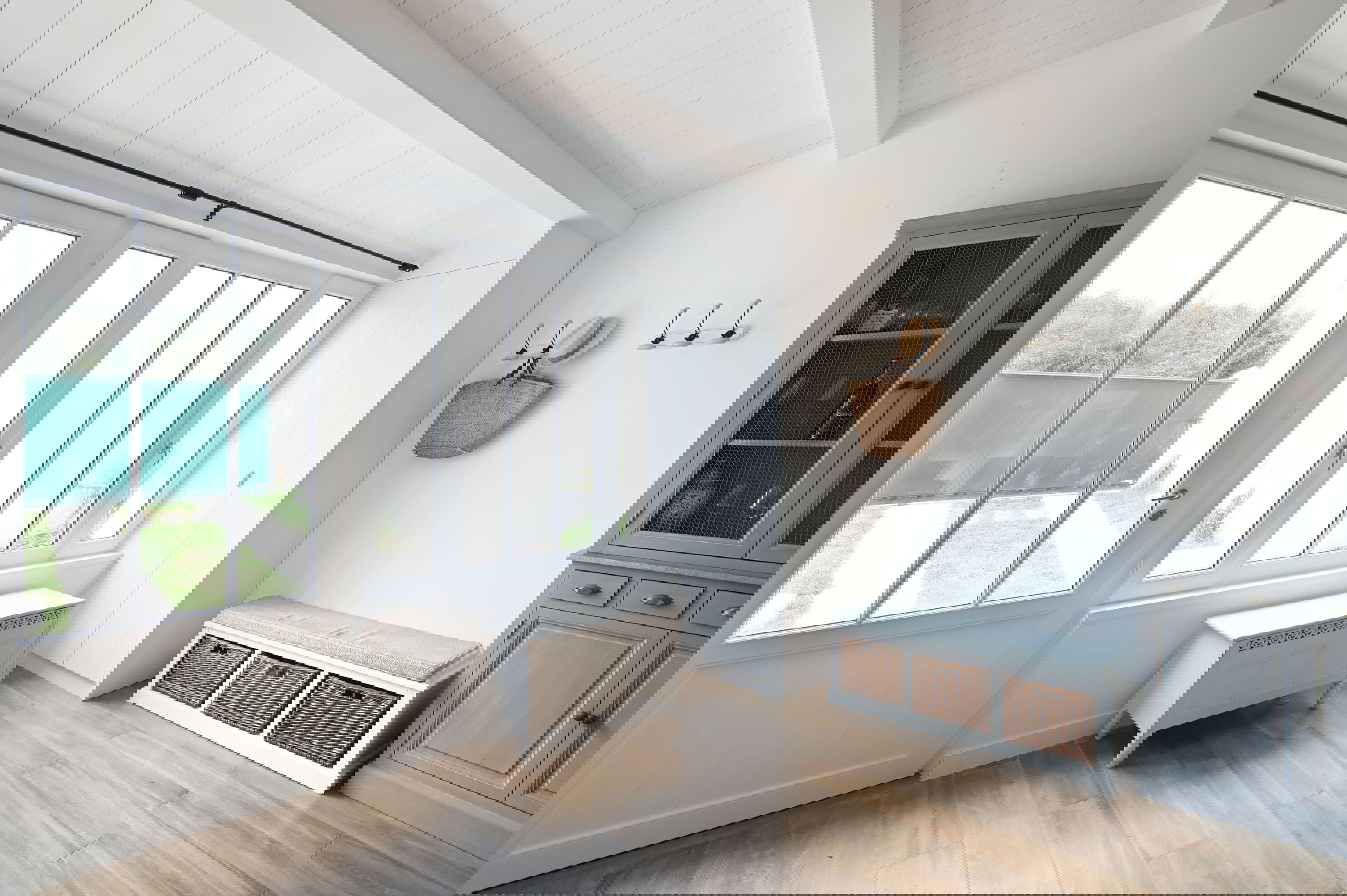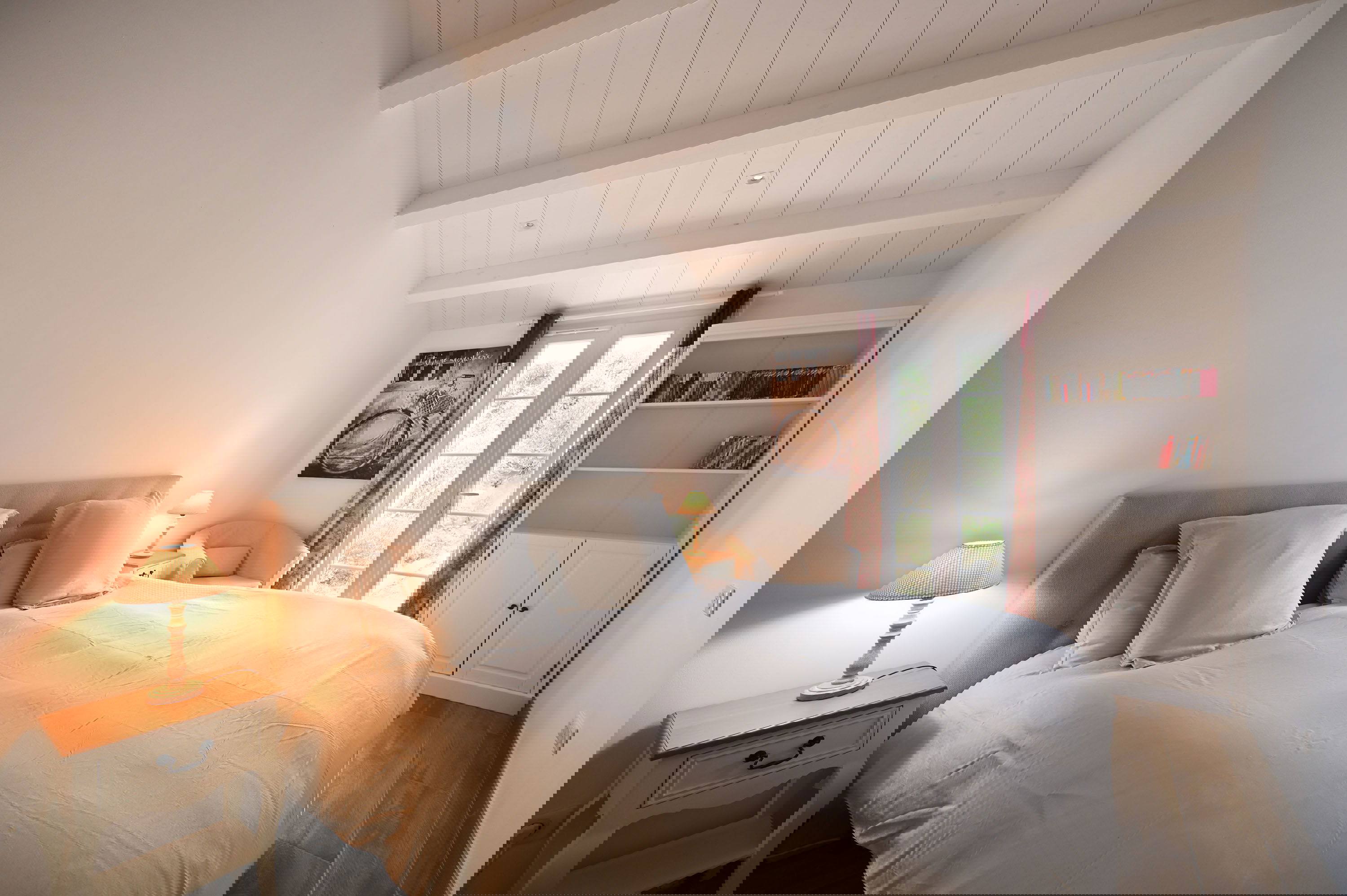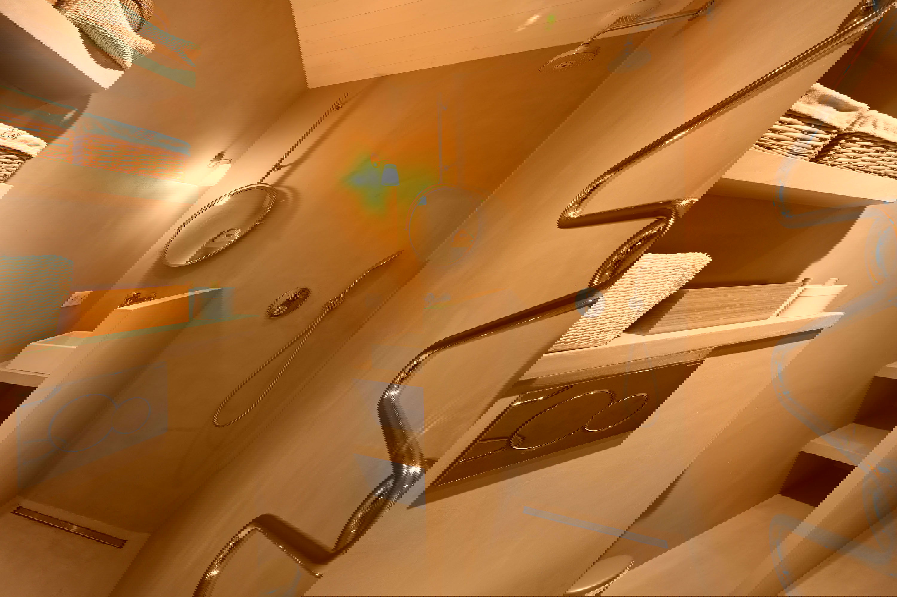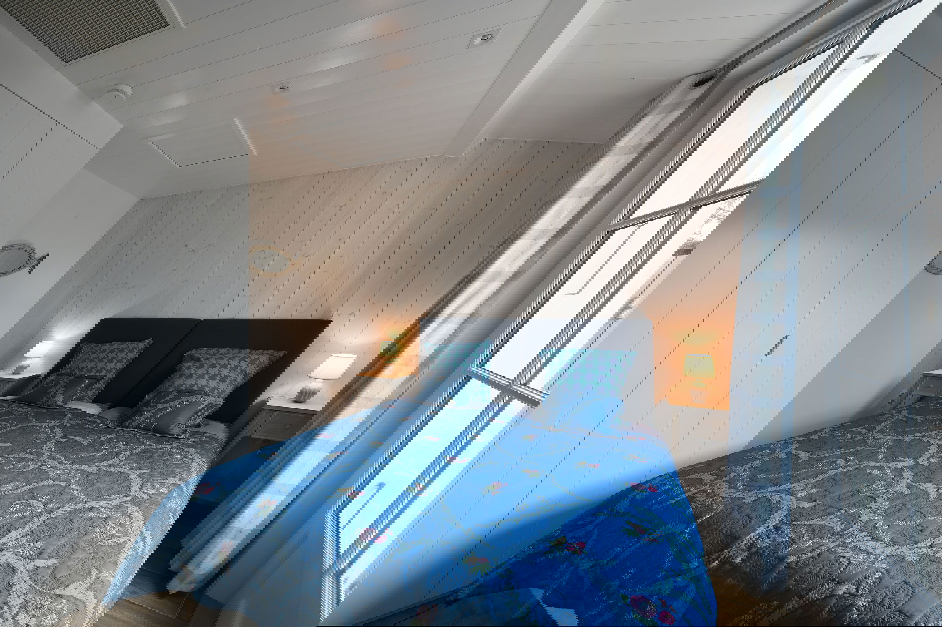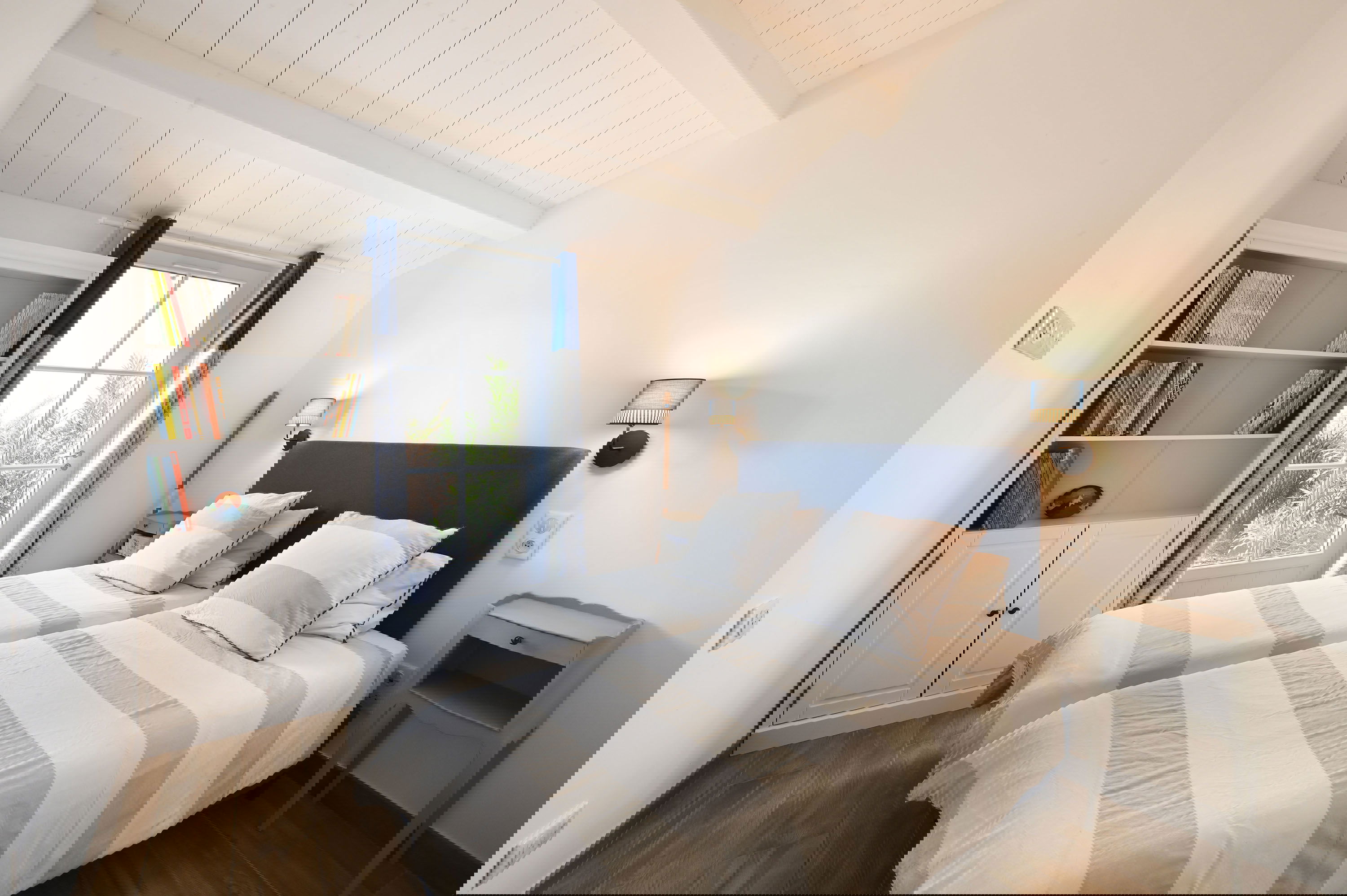 Der Schlafbereich verfügt über zwei Schlafzimmer mit Doppelbetten (160 und 180 cm), zwei Schlafzimmer mit zwei Einzelbetten, zwei Duschbäder mit WC und eine Waschküche.