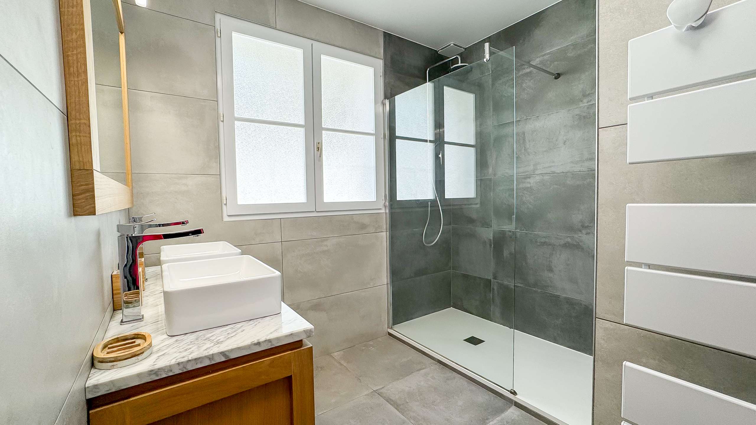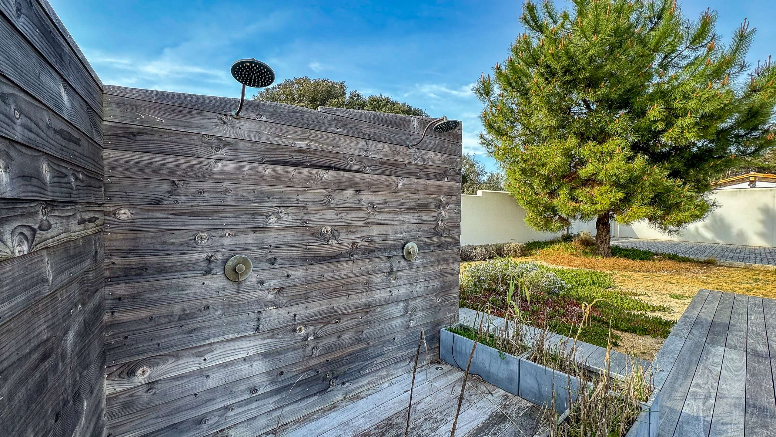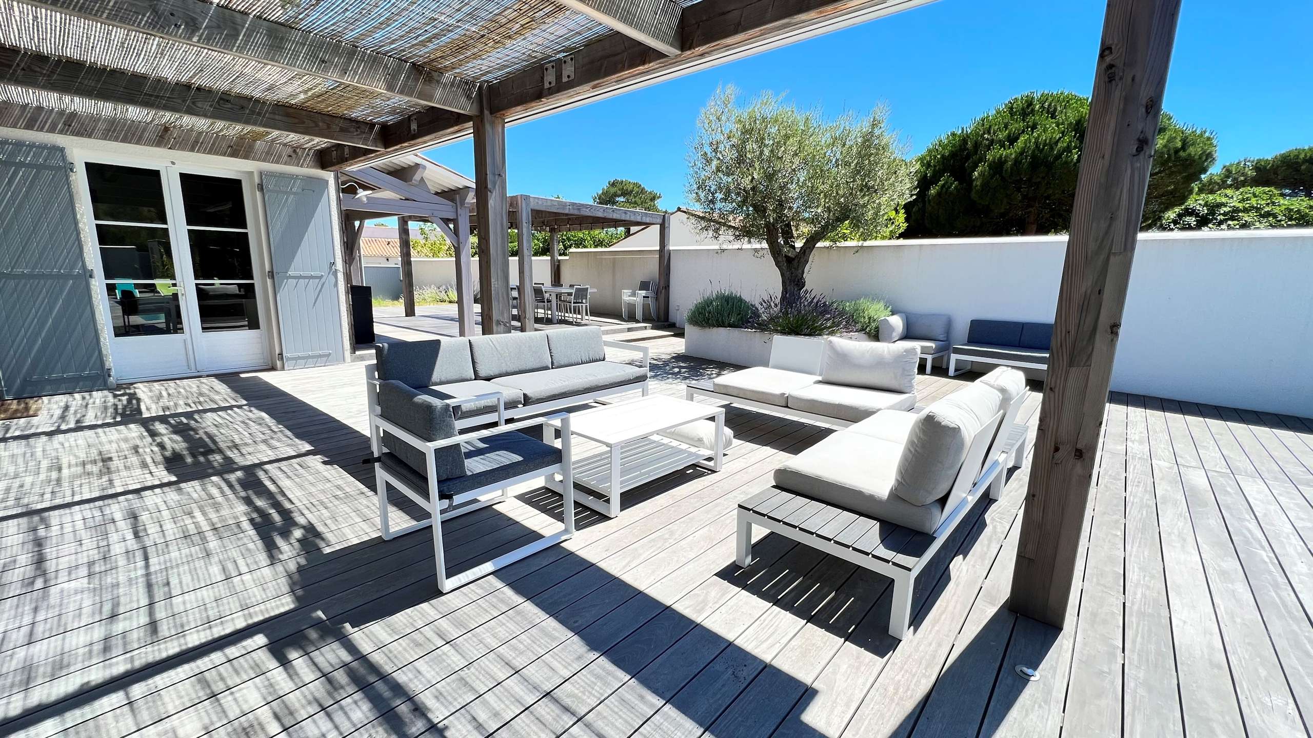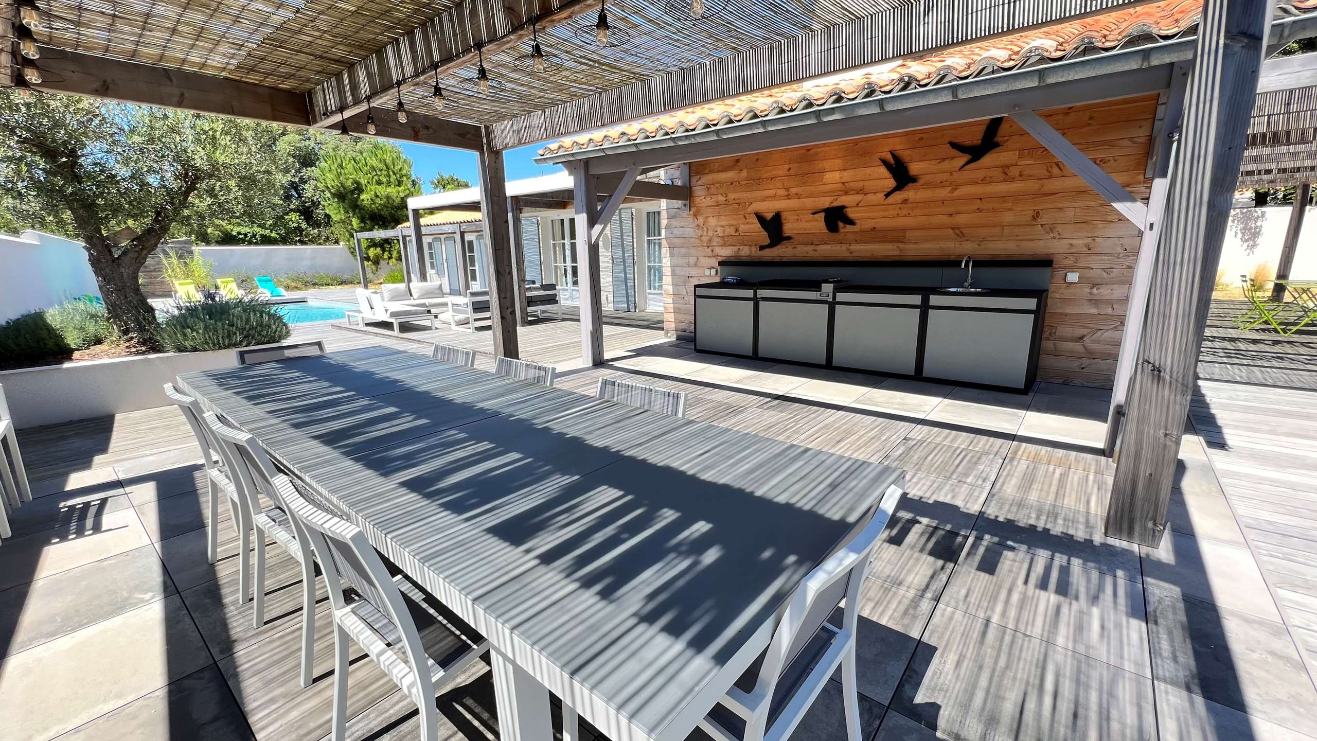 Hervorragende komplett renovierte Villa mit Pool in Strandnähe Hervorragende komplett renovierte Villa mit Pool in Strandnähe bestehend aus: EINGANG von 2,76 m² mit Blick HAUPTRAUM (Ost / West) 52,48 m² mit einem Wohnzimmer: einem Sofa, 2 Sesseln, einem Sideboard, ein Fernseher, ein Buffet. Wohnzimmer mit Esstisch, Bänken und Stühlen. Küchenbereich mit Spüle, Induktionskochfeld (4 Flammen), Backofen, Mikrowelle, Kühlschrank, Gefrierschrank, Abstellraum. 7,5m² Flur führt zu: SCHLAFZIMMER 1 (Süd) 10,57m² mit 1 Bett x 160, 1 Sessel, Kommode, Nachttische. SCHLAFZIMMER 2 (Süd) 10,44m² mit 1 Bett x 160, 1 Sessel, Nachttische, Kommode. BADEZIMMER (Nord) 6m² mit Doppelwaschbecken, Dusche, Waschtisch, Stauraum. Separates WC. SCHLAFZIMMER 3 (Nord) 9,7m² mit 1 Bett x 160, Nachttischen, einer Kommode, einem Hängeschrank (Regale + Kleiderschrank). RUHERAUM (Süd) 14,92 m² mit Sofa, Couchtisch, Sideboard. BADEZIMMER (blind) 2 m² mit Dusche, Waschbecken, Toilette. SCHLAFZIMMER 4 (Süd) 17,8 m², Schlafsaal mit 2 x 2 Etagenbetten. AUSSEN: ein großer Gartenbereich mit Wüstenpflanzen, eine Sommerküche unter Pergolen, Gartenmöbeln und Liegestühlen. Beheiztes SWIMMINGPOOL (geöffnet vom 15. Mai bis 15. September): 10m x 4m, geschützt durch einen elektrischen Vorhang. KABELLOS. Bettwäsche und Endreinigung inklusive.