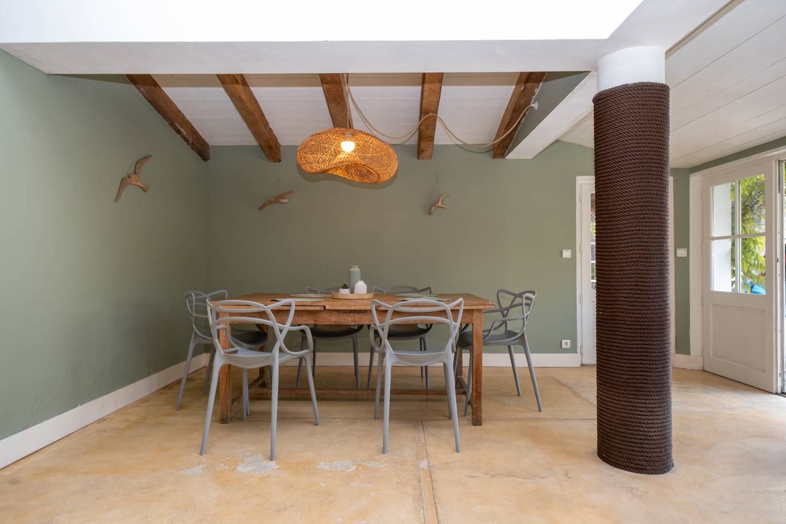 * Ein großes Wohnzimmer, Esszimmer von 70 m² mit einem Tisch für 10 Personen und Blick auf den Pool