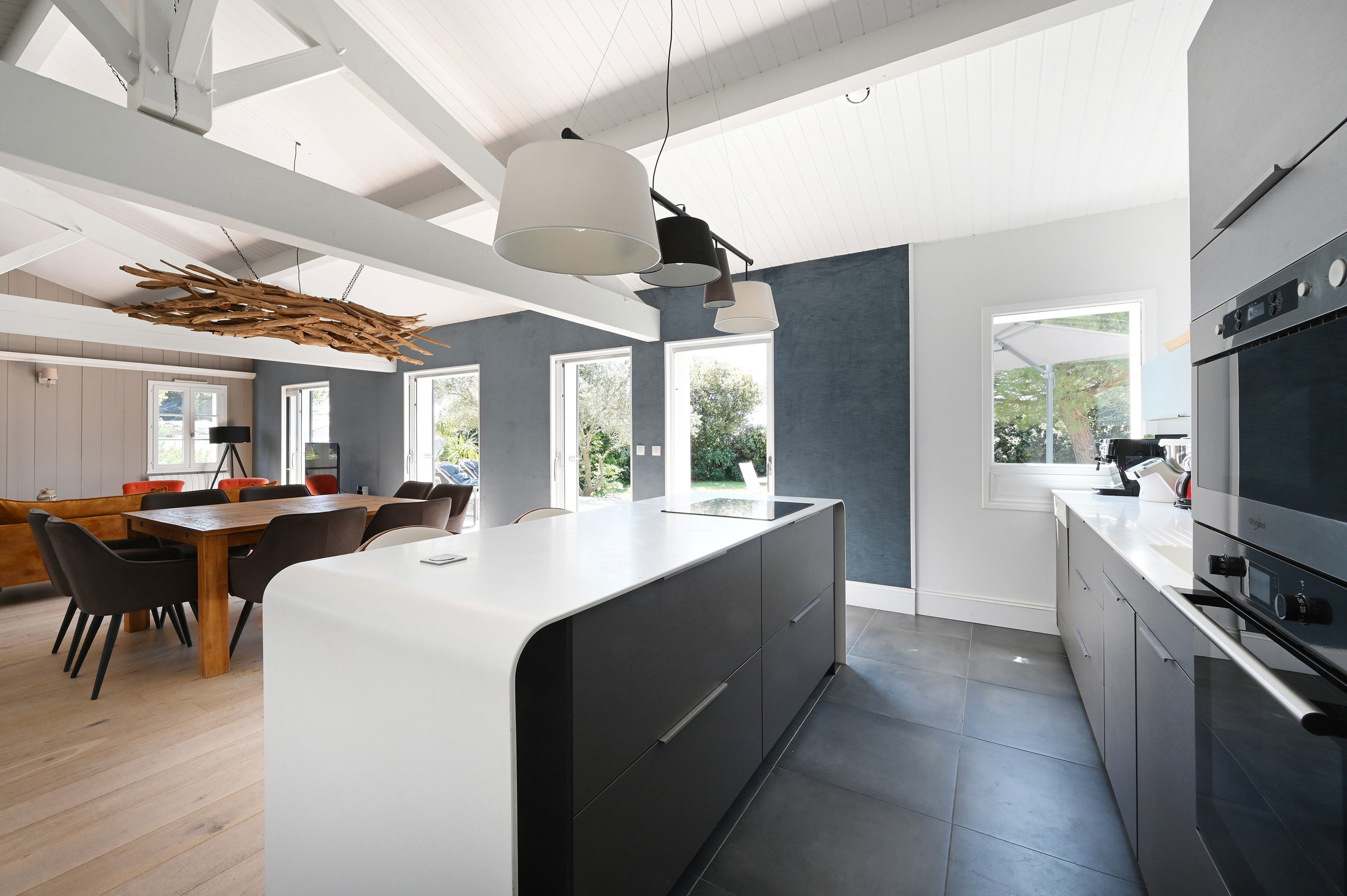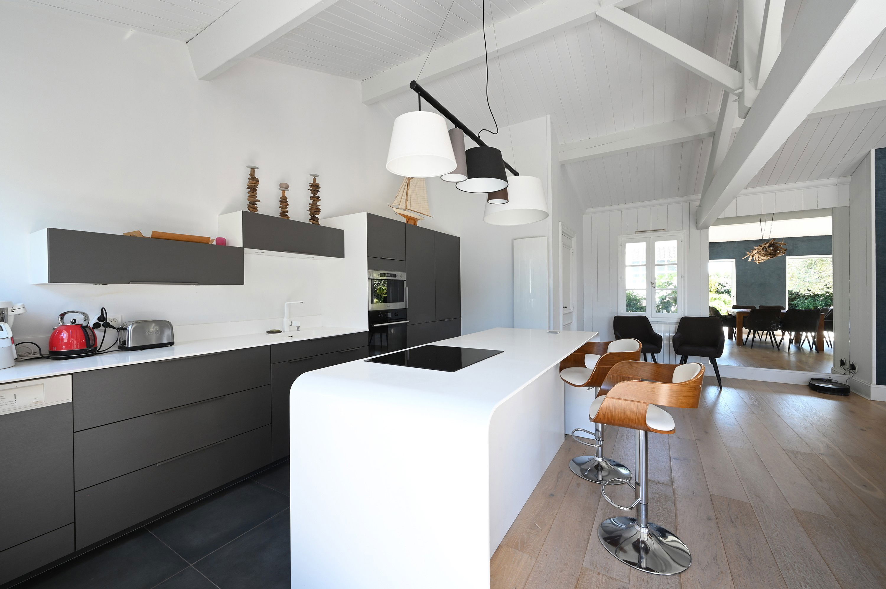 - Sie kommen in ein großes Wohnzimmer von 80 m2, wo Sie das Wohnzimmer, das Esszimmer und eine offene Küche mit einer sehr modernen zentralen Insel finden.